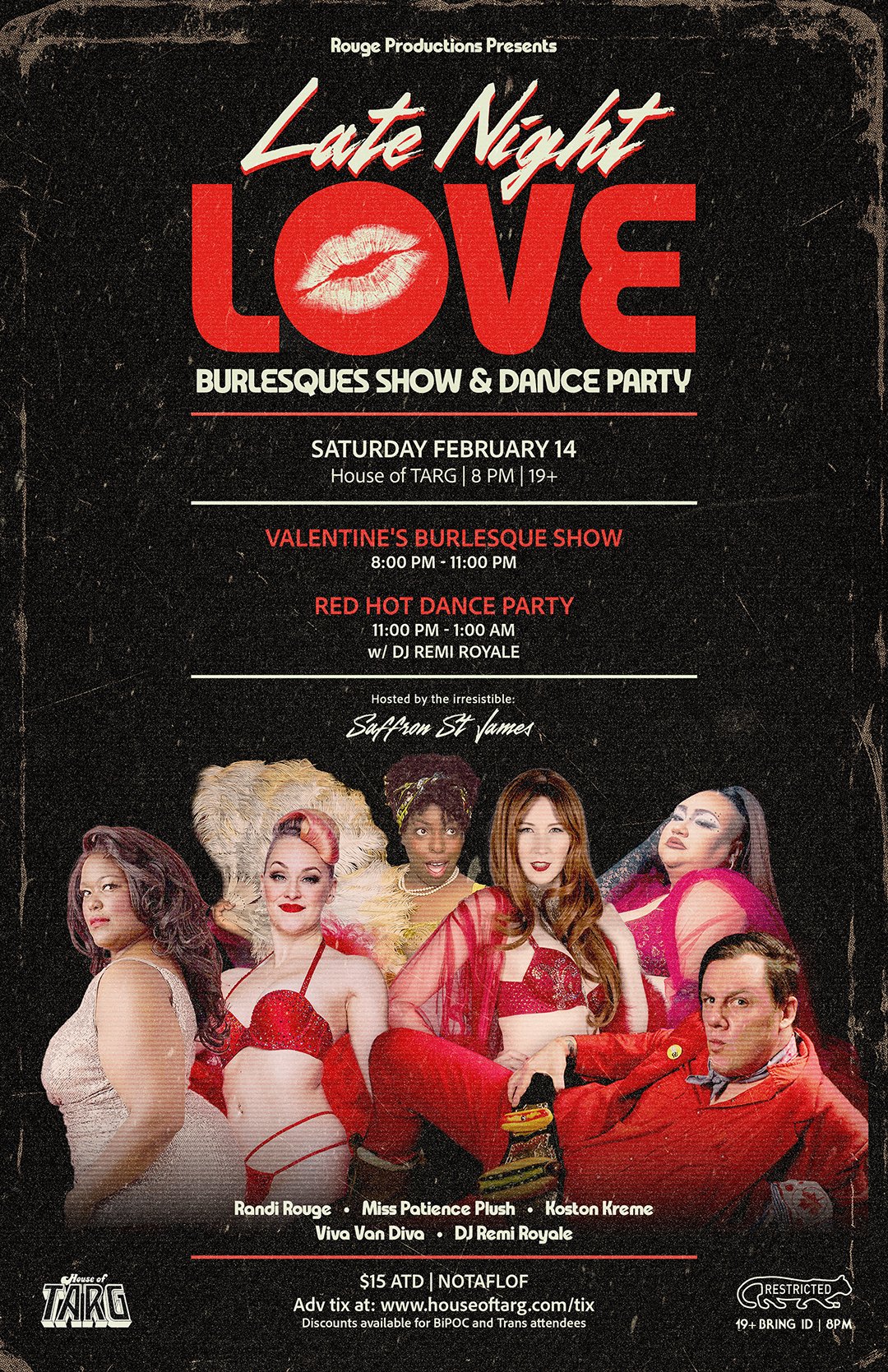BIPOC & TRANS Discounts available. JOIN ROUGE PRODUCTIONS FOR LATE NIGHT LOVE — a Valentine’s burlesque show dripping in glamour, tease, and after-dark mischief. Fall head over heels for sultry performances by - Randi Rouge - Miss Patience Plush - Koston Kreme, - Viva Van Diva Hosted by the irresistible: Saffron St. James 3 sets of seduction, sass, and sparkle 8:30, 9:30, 10:30.