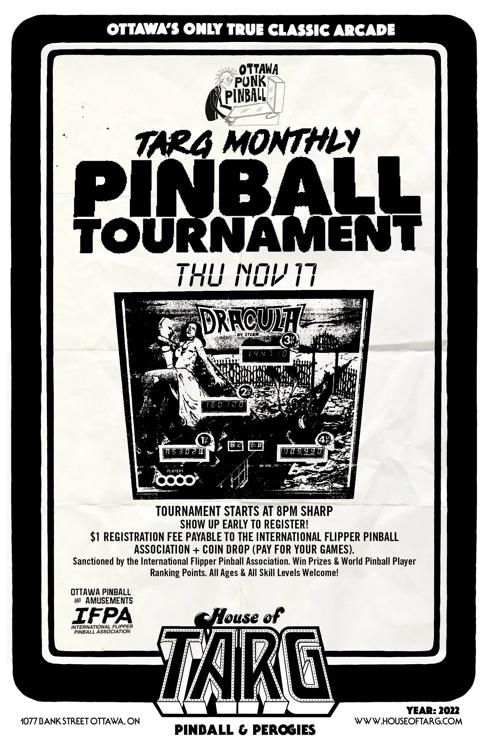 Presented by: Ottawa Punk Pinball, House of TARG Cover: Free Tournament Fee: $1 Start Time: 8pm / All Ages/ All Skill Levels